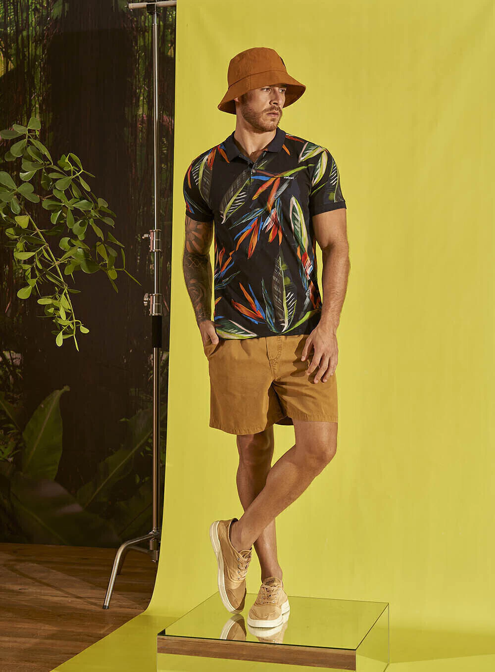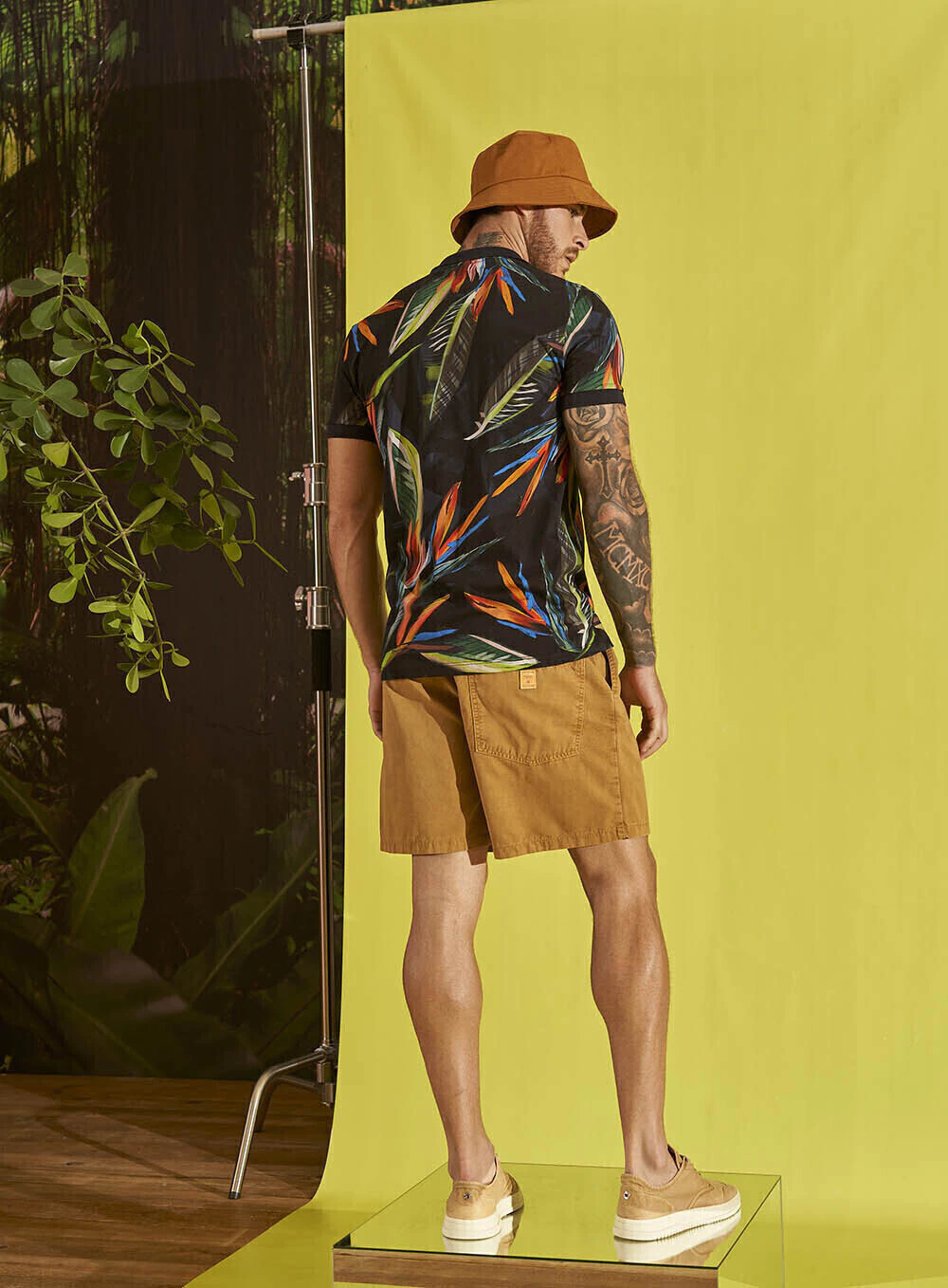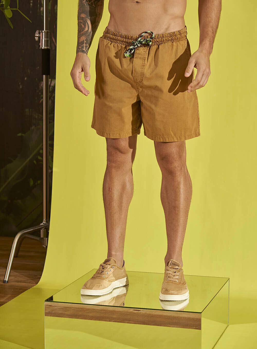 Bermuda em sarja apresenta shape levemente solto com modelagem de comprimento acima do joelho. A peça possui cós com aplicação de elástico interno e cadarço embutido para amarração, bolsos dianteiros faca e bolsos traseiros.
