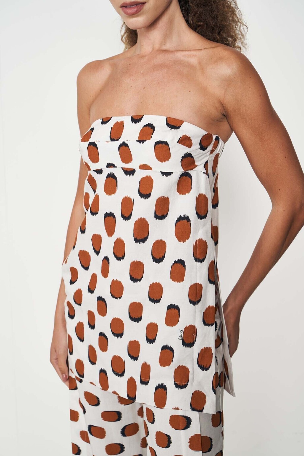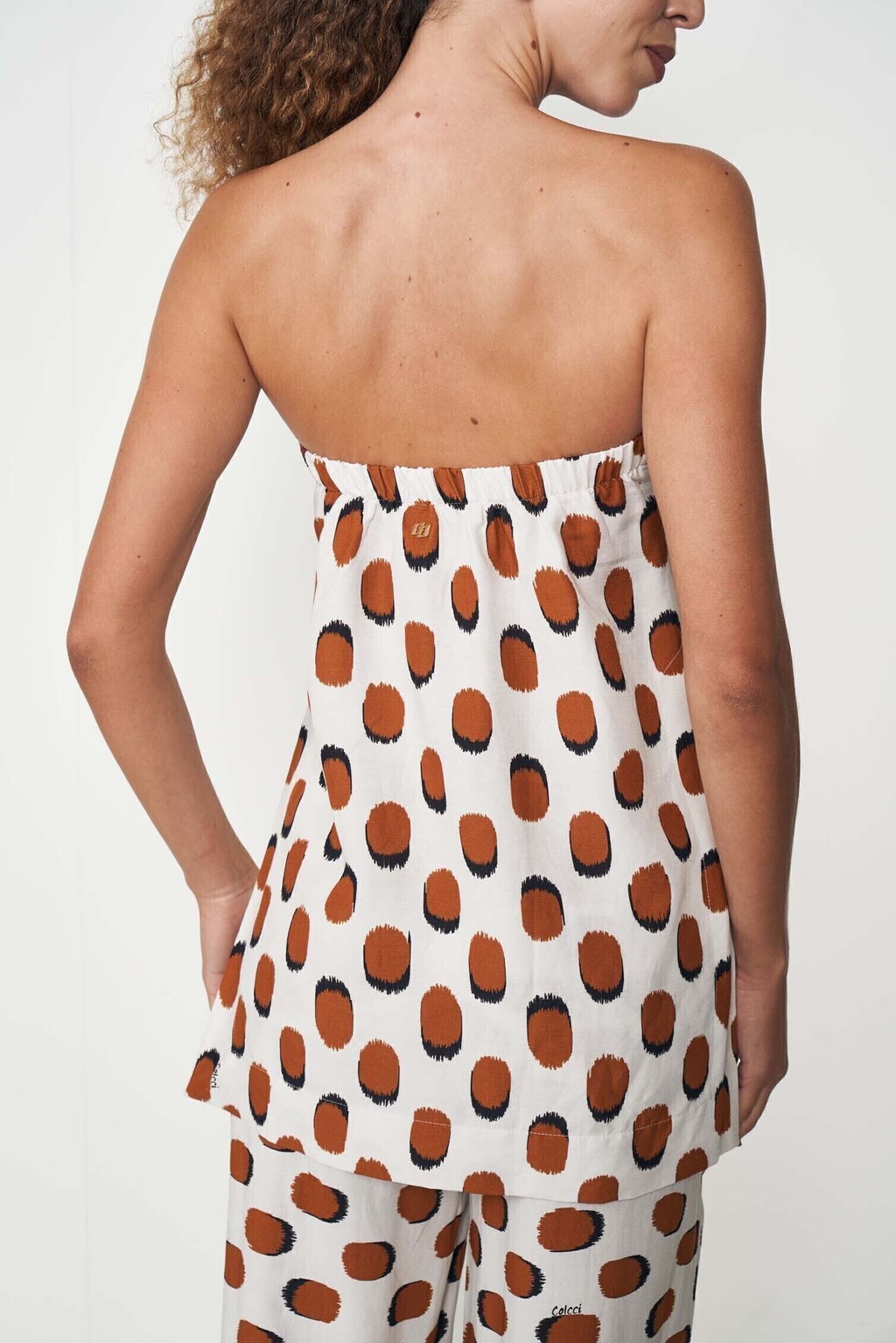 Blusa: Blusa tomara que caia com estampa de bolinhas.