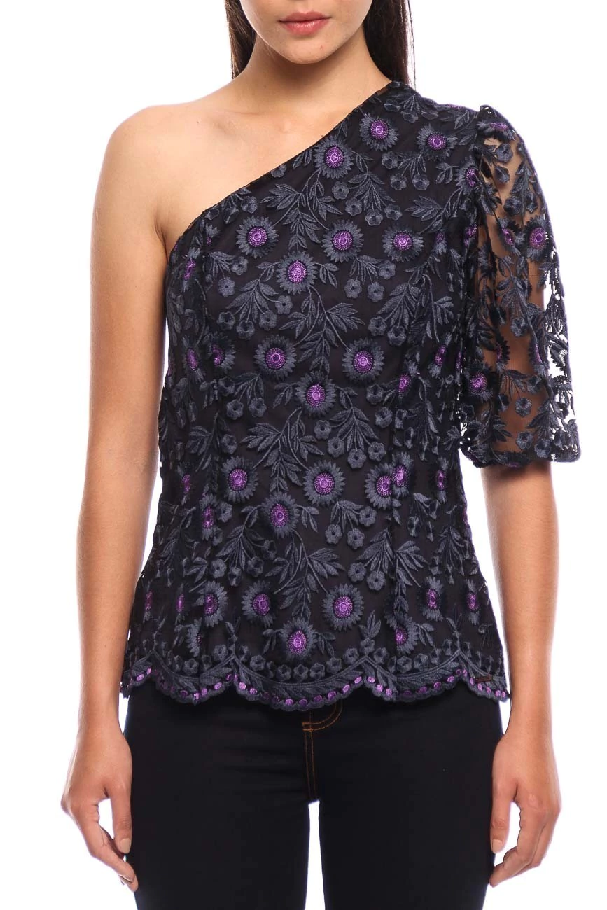 Blusa de tule bordado um ombro só. A peça possui forro interno frente e costas, cabeça da manga com franzido, boca da manga com elástico interno e abertura na lateral direita com zíper semi invisível.