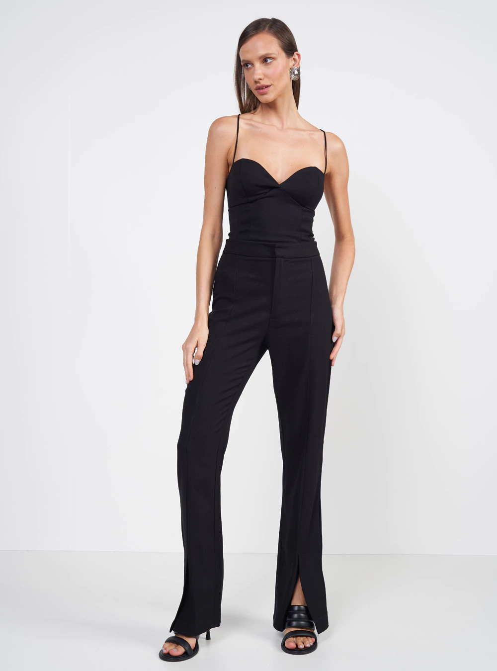 Calça Flare Alfaiataria Com Fenda apresenta shape reto e modelagem slim, cintura alta, cós duplo com fecho em botão e zíper frontal e barra inferior com fenda.