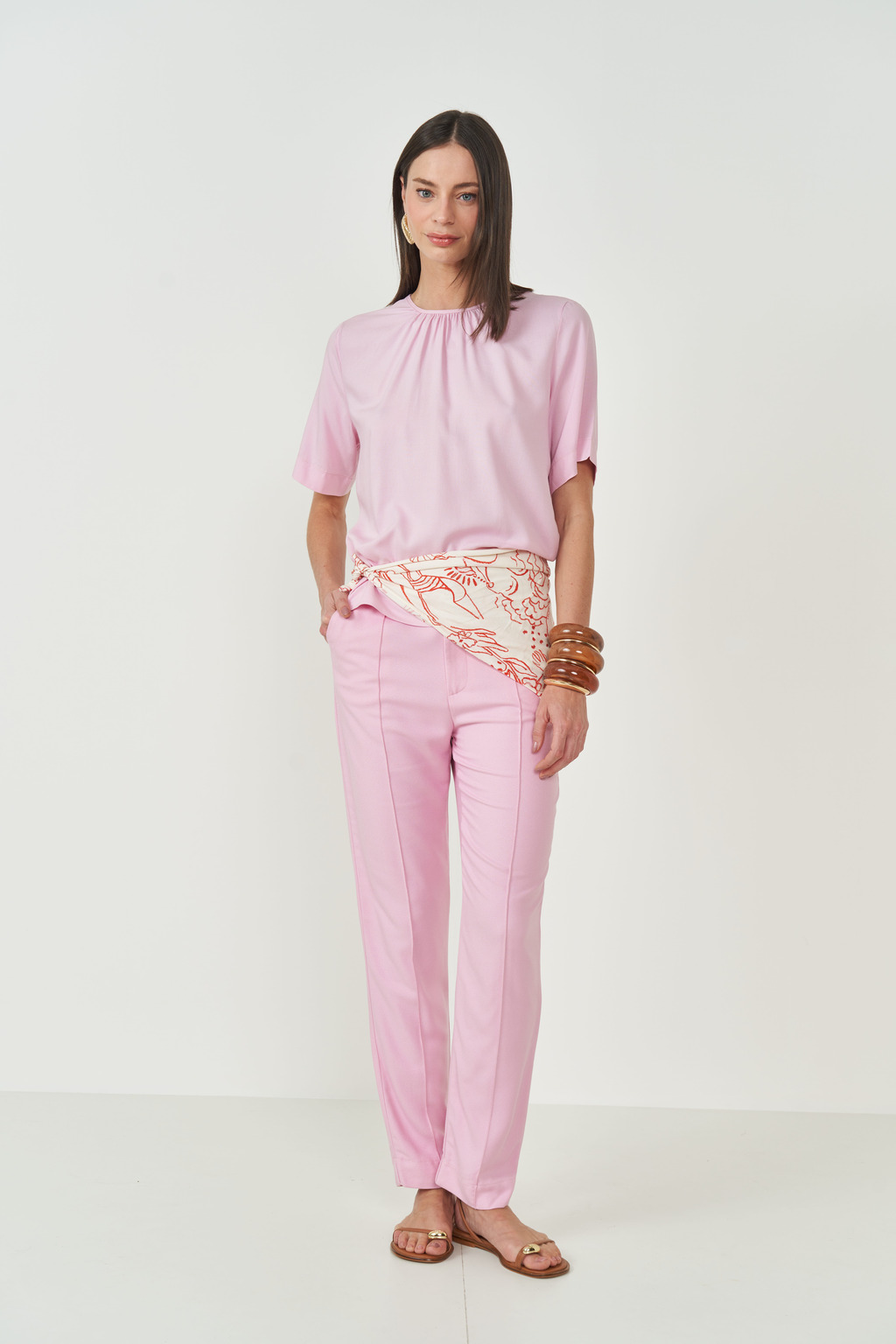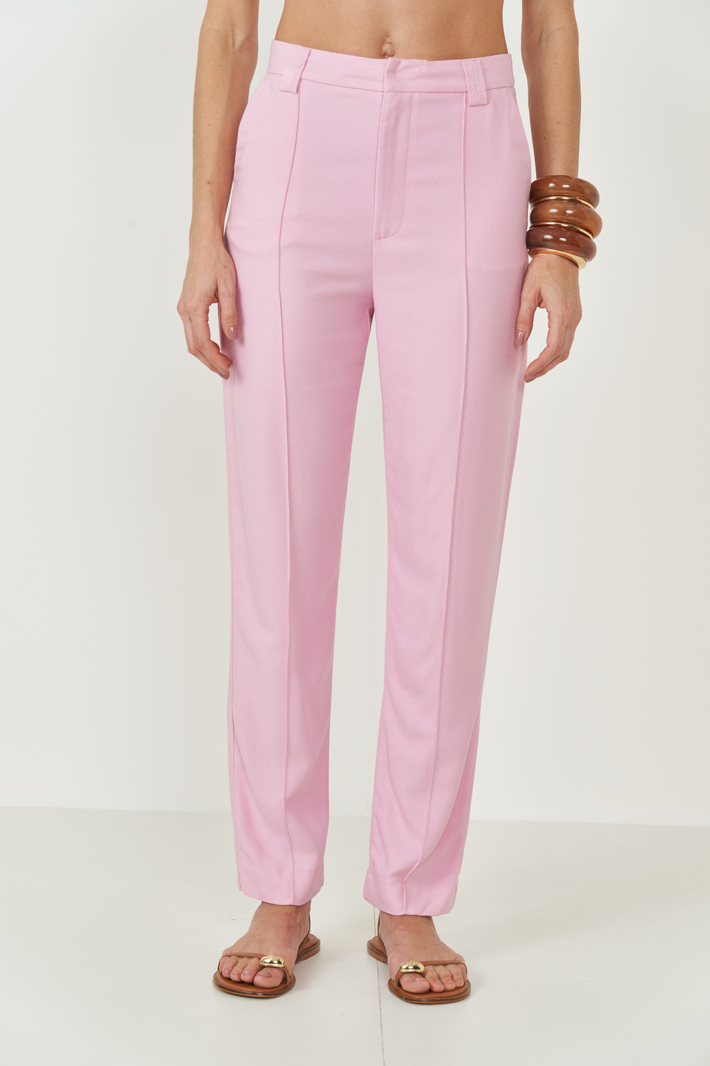 Detalhes: Pregas frontais, cós estruturado, acabamento refinado nas costuras e passantes para cinto.