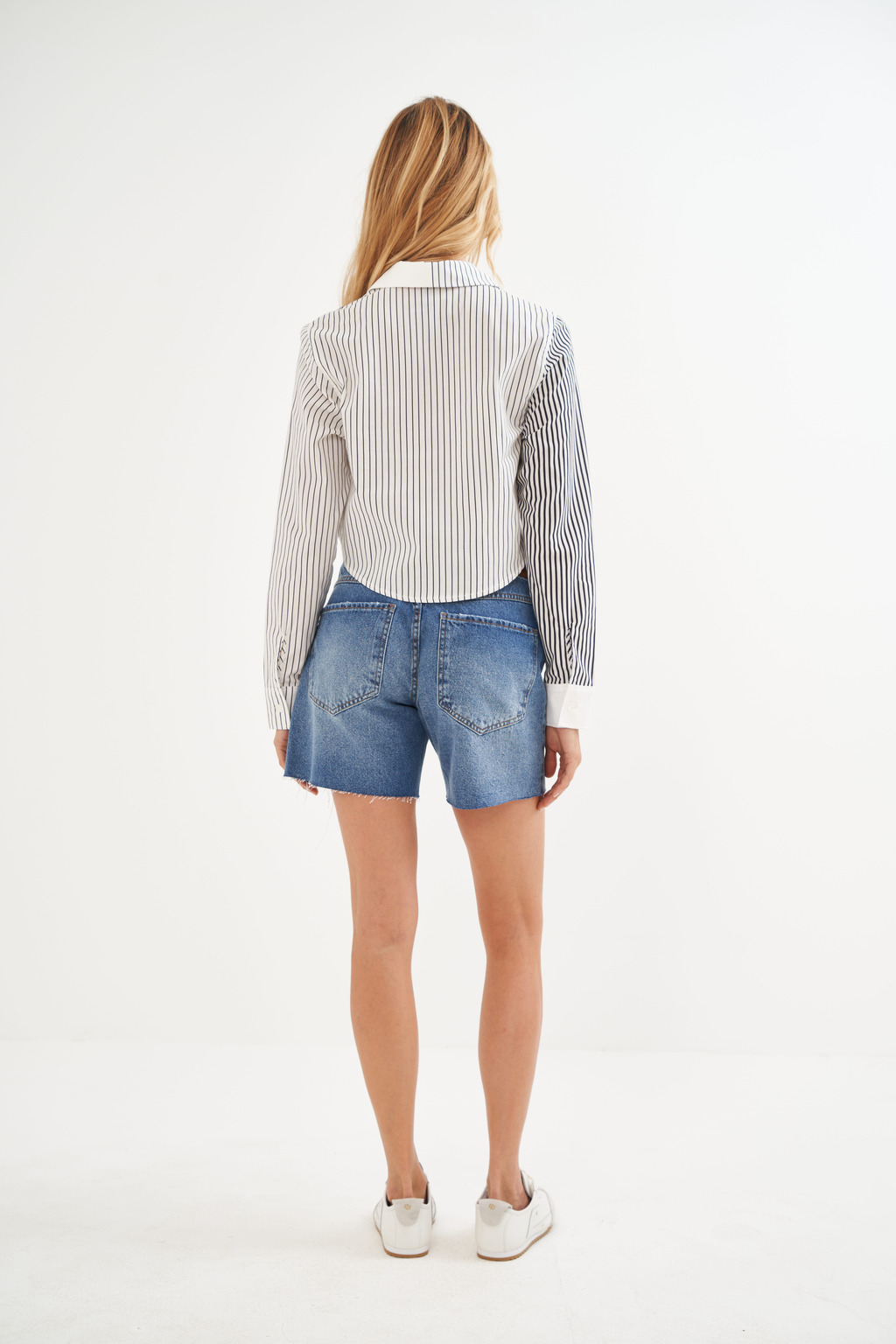 Para um look moderno e estiloso, combine sua Camisa Cropped Listrada com um short jeans, como o da foto, e tênis. O resultado é despojado e cheio de atitude!