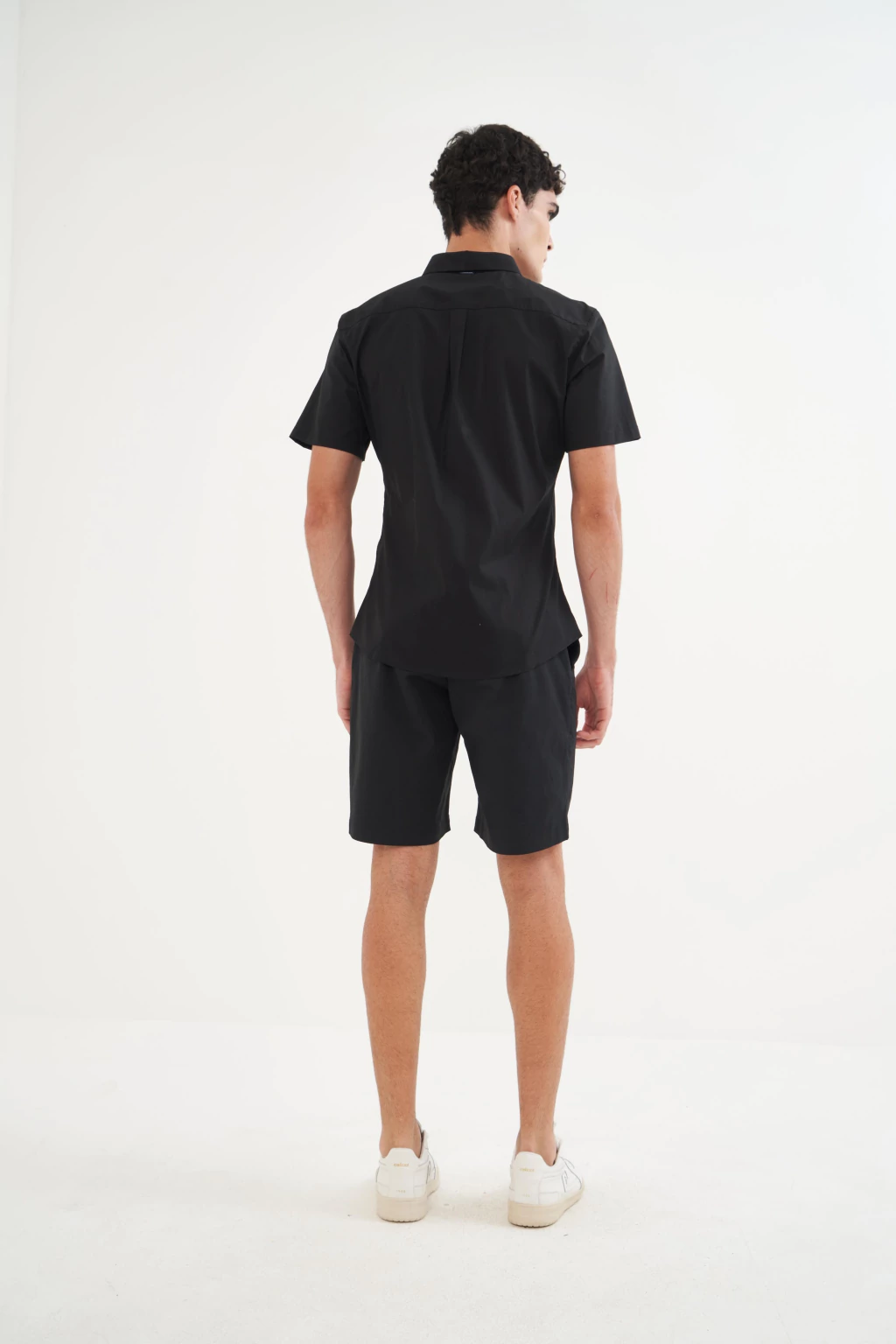 Camisa: Manga curta, modelagem slim fit, gola clássica, fechamento frontal com botões.