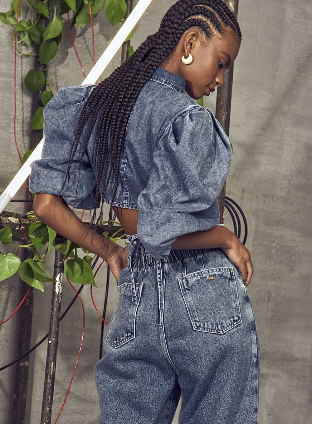 Camisa Jeans apresenta shape slim e modelagem cropped estruturada. A peça possui gola em dobra, mangas estruturadas abaloneadas com elástico interno na barra, abertura frontal com fecho de botões e barra que se prolonga em faixas para amarração na cintura.