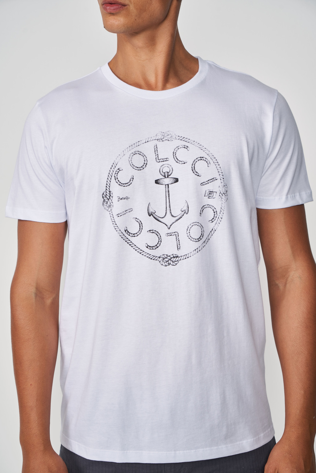 Camiseta clássica na cor branca, com mangas curtas e gola redonda. A estampa frontal com tema náutico, inspirada na coleção Ocean Art, é o grande destaque da peça, adicionando um toque de estilo e originalidade ao visual.