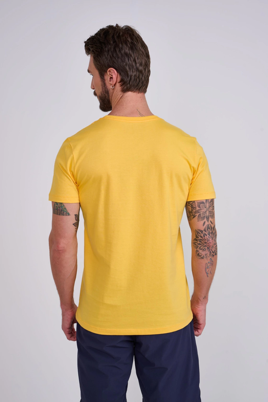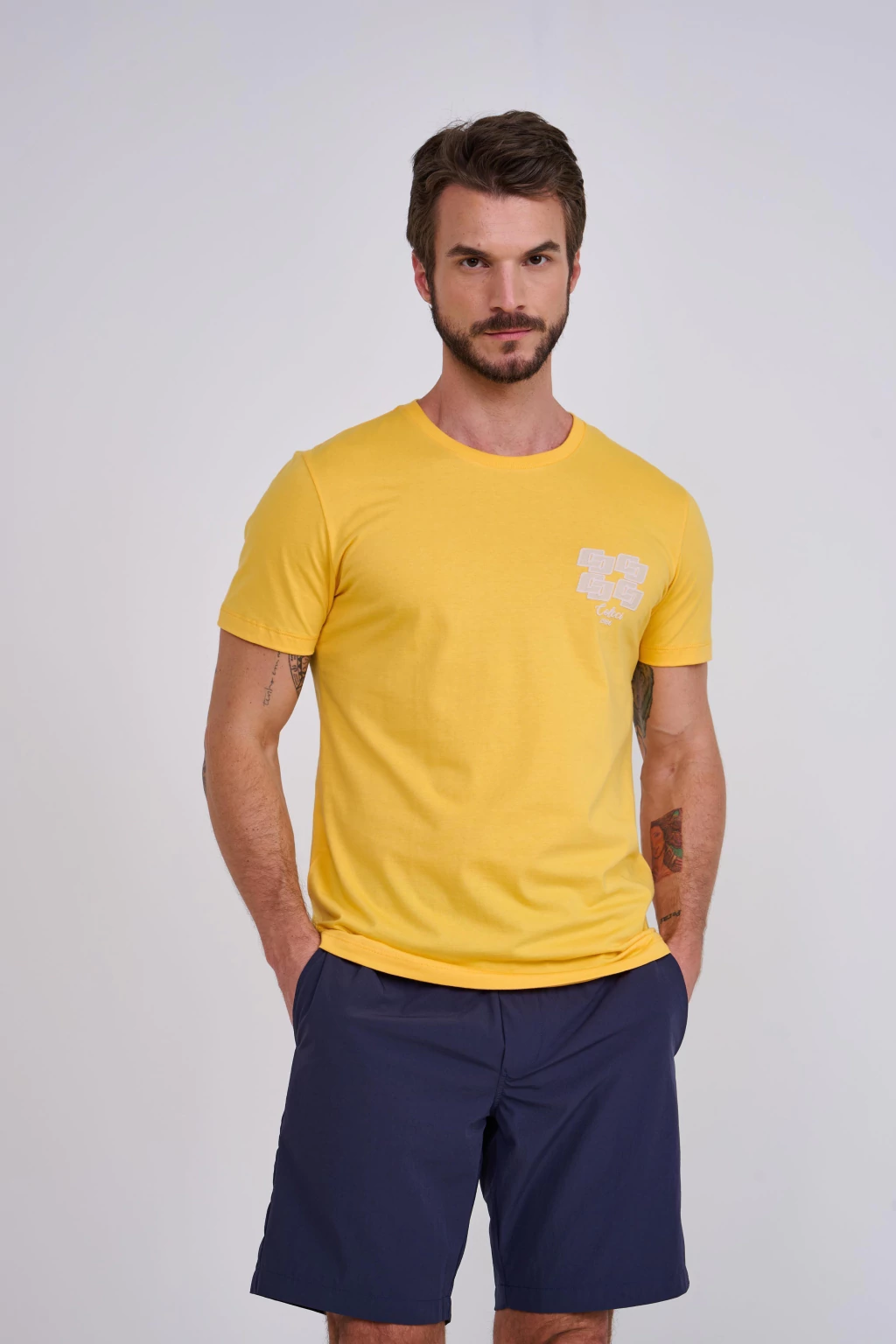 Para um look que exala a leveza e o estilo do verão Colcci, combine esta camiseta amarela com bermudas em tons neutros ou contrastantes, como o azul marinho da imagem, para um visual casual e moderno. Adicione tênis brancos ou sapatênis para um toque despojado e confortável, perfeito para um passeio à beira-mar ou um almoço informal. Para um happy hour, experimente com uma calça de linho clara e mocassins. Esta peça é a base versátil para looks que celebram a autenticidade e o frescor da estação, perfeita para diversas ocasiões, do dia à noite.