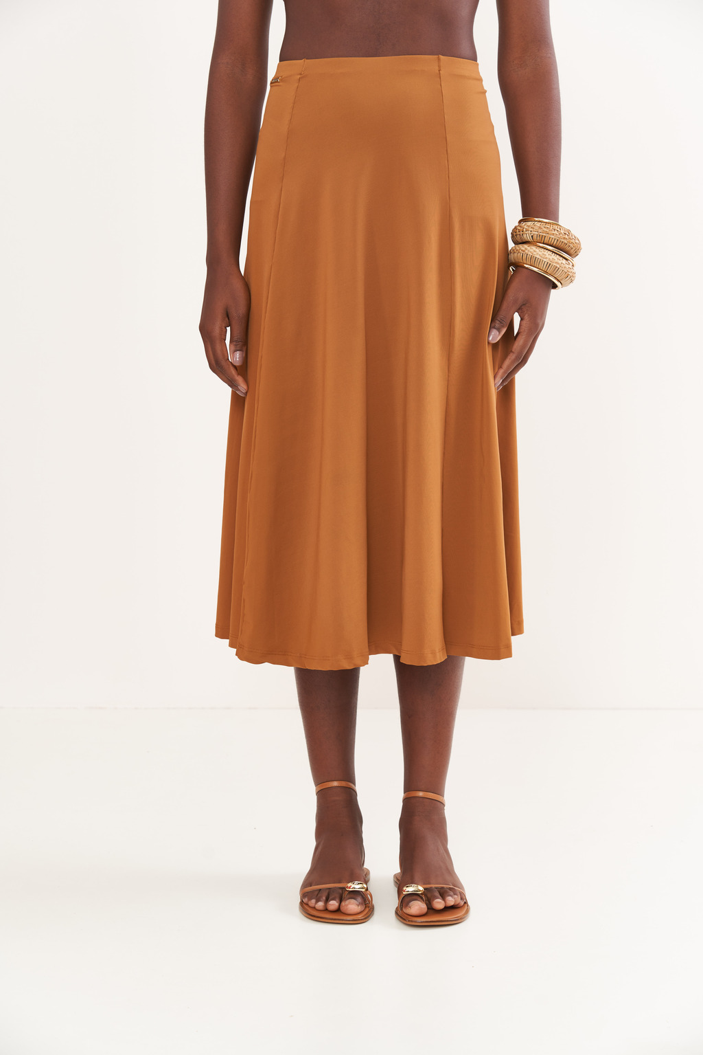 Design: Modelagem evasê com comprimento midi, criando uma silhueta feminina e cheia de movimento. A cintura alta e o cós limpo valorizam o corpo, enquanto os recortes verticais garantem um caimento perfeito e alongam visualmente.