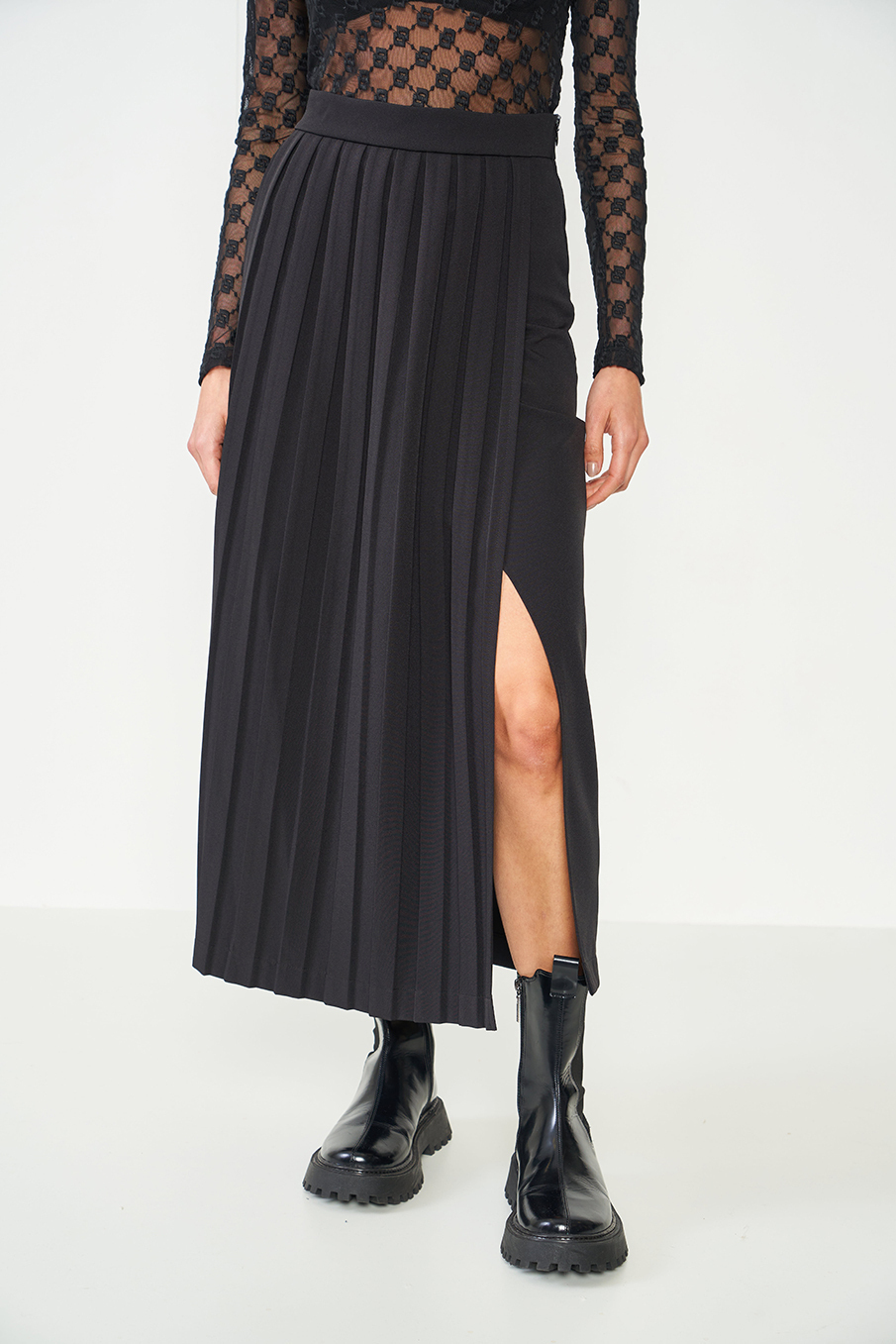 Essa saia é uma peça que esbanja estilo. A saia apresenta shape reto e uma modelagem joana. A peça possui cintura alta, zíper semi invisível na lateral esquerda, detalhe plissado na frente, fenda com transpasse lado direito sobre esquerdo e bolsos embutidos falsos.