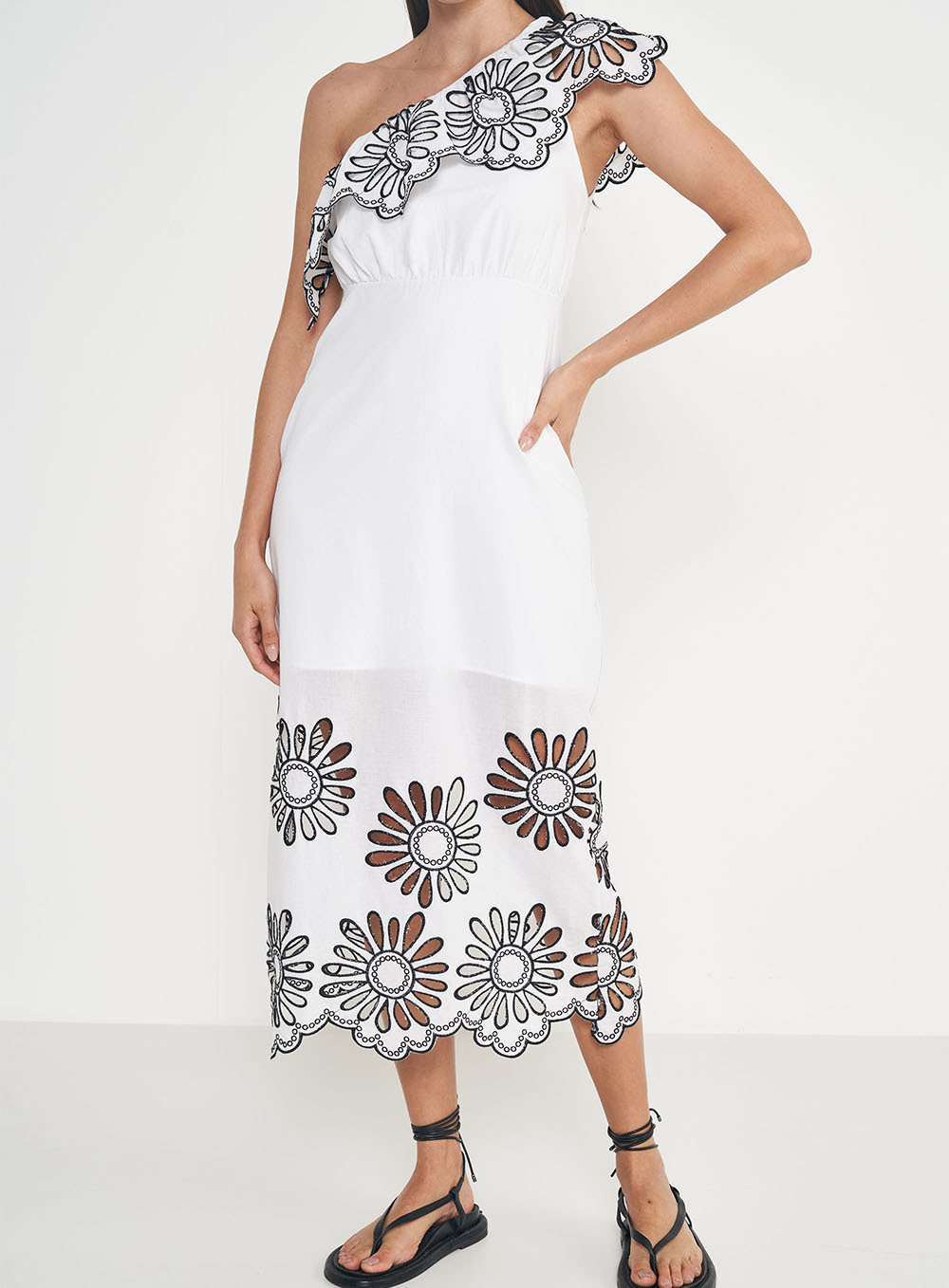 Design: Modelagem que valoriza a silhueta, com um ombro só que adiciona um toque de sensualidade. Bordado floral que traz um toque de charme e delicadeza.