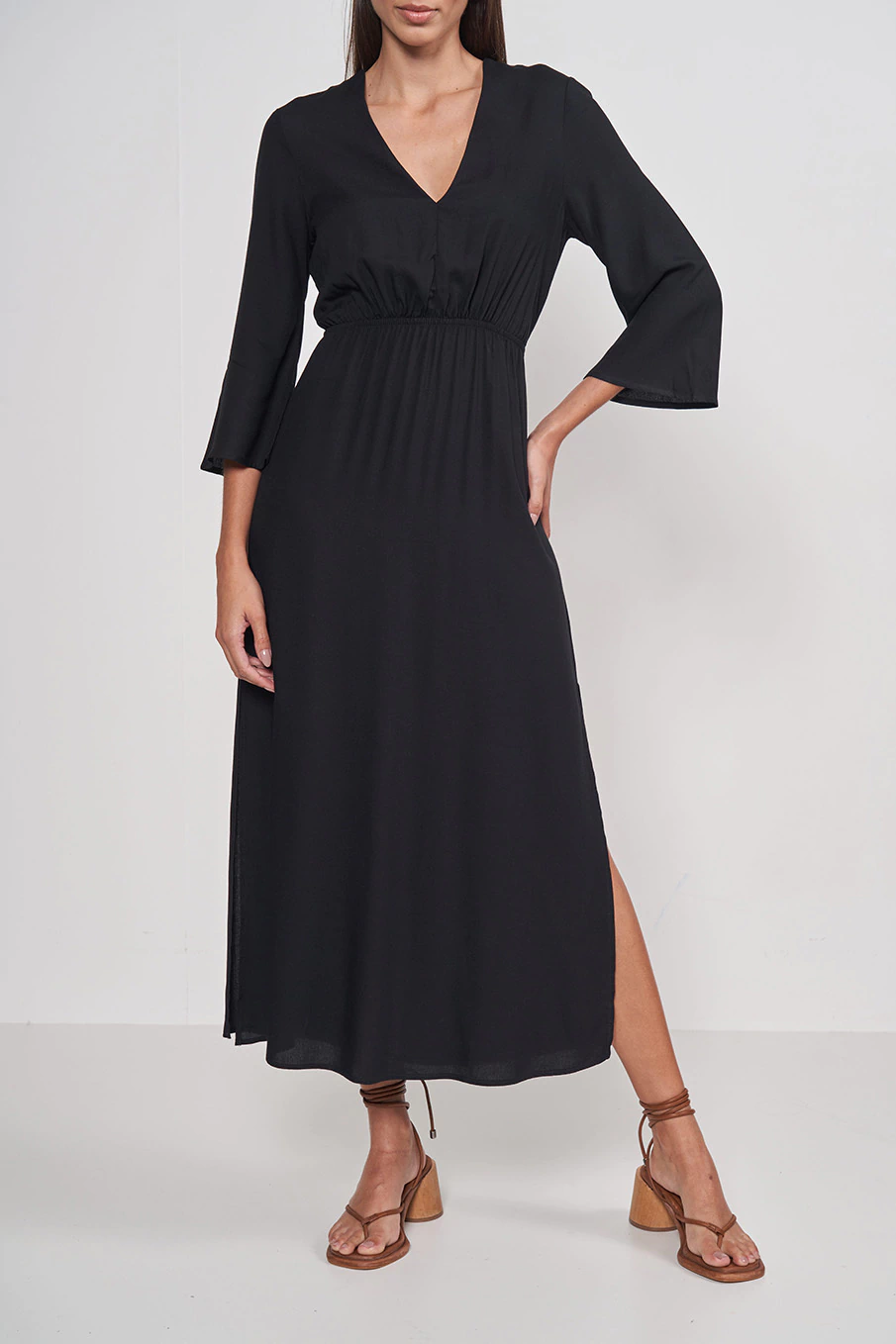 Vestido apresenta uma modelagem comfort. A peça também possuidecote V, busto com franzido, recorte frente, mangas ¾, cintura com franzidos, fenda chuleada e barra com bainha.