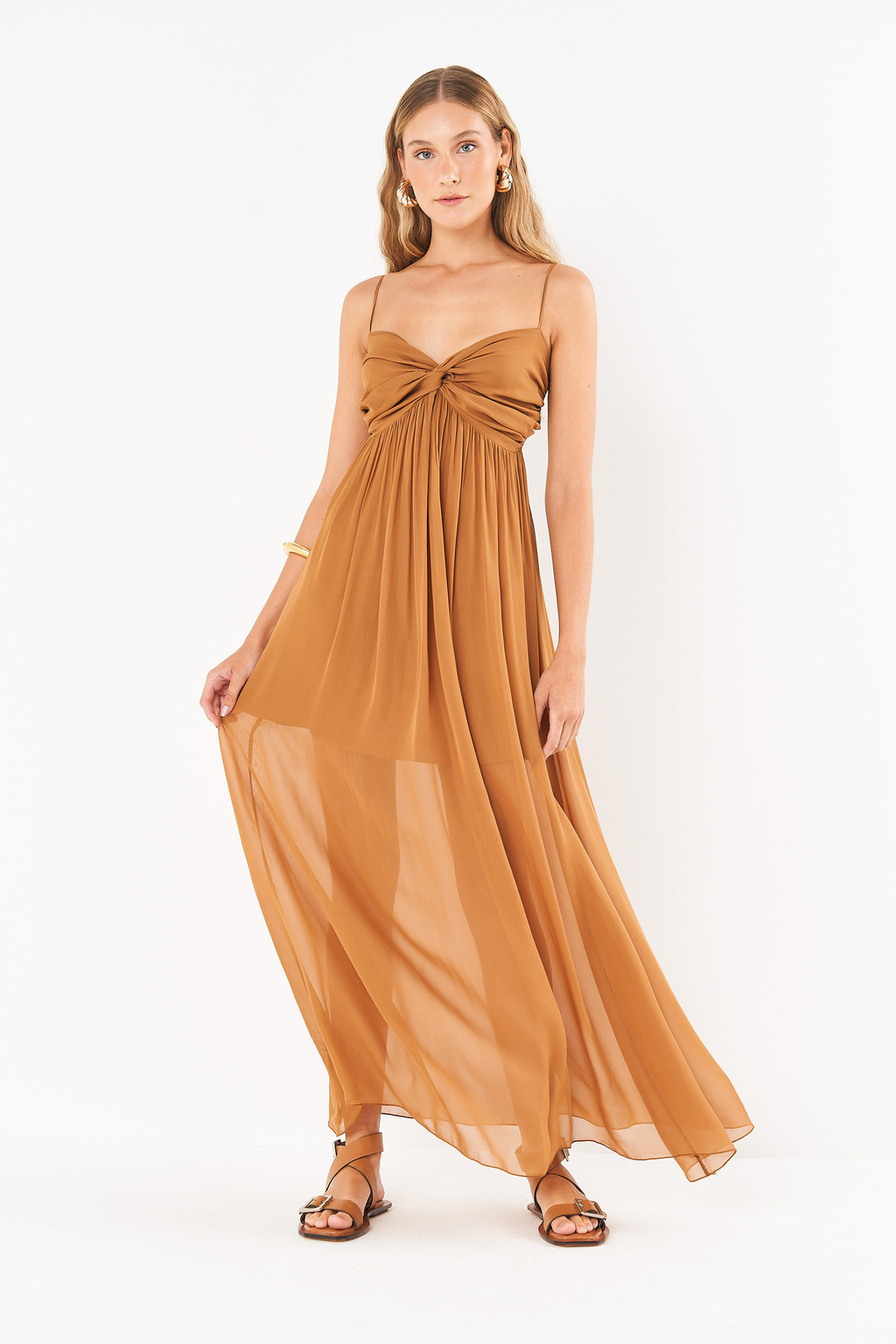 Design: Modelagem longa e fluída, decote frontal drapeado/torcido, alças finas, parte de trás com detalhe em lastex.