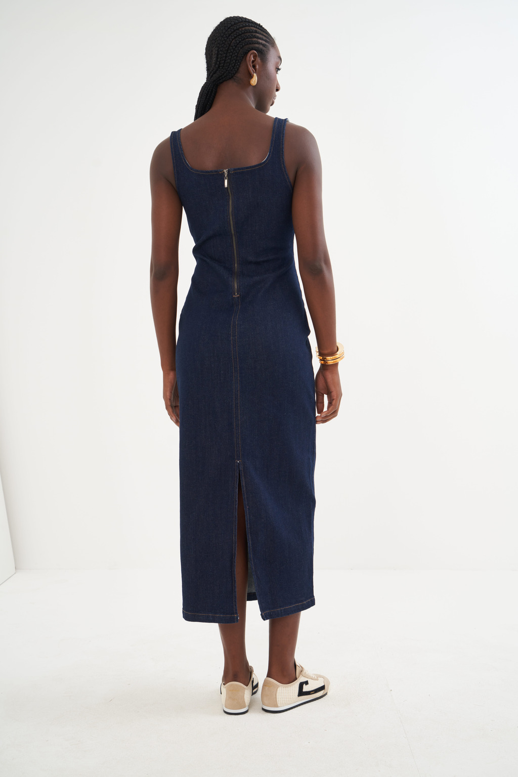 Vestido: Modelagem midi e ajustada ao corpo, sem mangas, com decote quadrado, fenda discreta na parte de trás e fechamento por zíper nas costas.